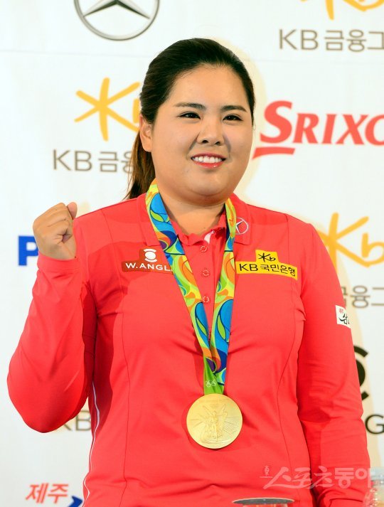 2016 리우올림픽 여자골프 금메달리스트 박인비가 29일 서울 양재동 더케이호텔에서 열린 ‘골든커리어 그랜드슬램’ 달성 기자회견에 참석해 카메라를 향해 포즈를 취하고 있다.