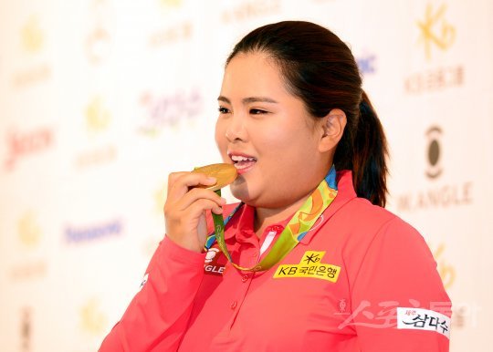 2016 리우올림픽 여자골프 금메달리스트 박인비가 29일 서울 양재동 더케이호텔에서 열린 ‘골든커리어 그랜드슬램’ 달성 기자회견에 참석해 카메라를 향해 포즈를 취하고 있다.