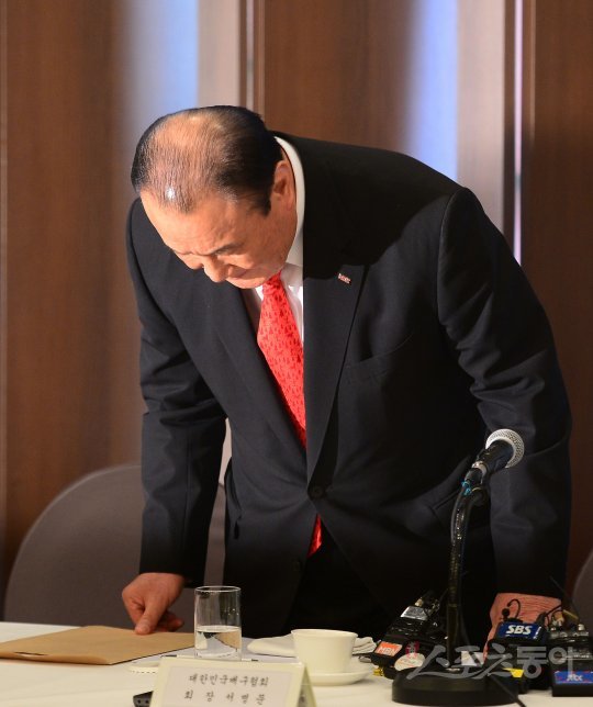 29일 서울 중구 프레스센터에서 제38대 대한배구협회장으로 선출된 서병문 신임회장의 부임 후 첫 기자간담회가 열렸다. 서병문 신임회장이 기자간담회에 앞서 고개 숙여 인사를 하고 있다.