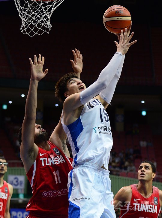 29일 서울 송파구 잠실실내체육관에서 허재 감독이 이끄는 대한민국 남자농구대표팀이 국제농구연맹(FIBA) 랭킹 21위의 튀니지 대표팀의 평가전이 열렸다. 김종규가 튀니지 선수의 수비를 앞에 두고 골밑슛을 하고 있다.