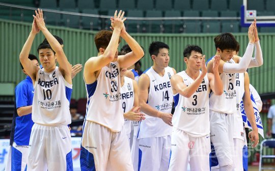 29일 서울 송파구 잠실실내체육관에서 열린 허재 감독이 이끄는 대한민국 남자농구대표팀과 국제농구연맹(FIBA) 랭킹 21위의 튀니지 대표팀의 평가전에서 대한민국이 65-59 승리를 거뒀다. 경기 후 대한민국 선수들이 팬들을 향해 인사를 하고 있다.