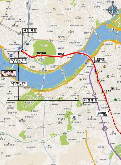 2단계는 용산 미군기지를 통과하는 한강 북측구간(용산∼신사)으로, 용산 미군기지 이전이 확정된 이후 추진된다.