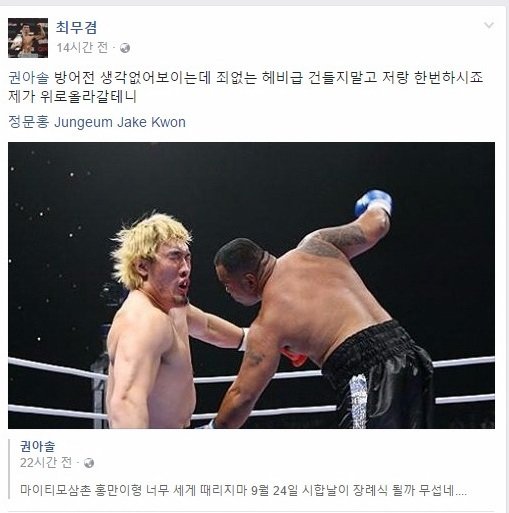 권아솔은 29일 자신의 SNS에 “마이티 모 삼촌, 홍만이 형 너무 세게 때리지 마. 9월 24일 경기가 장례식 될까 무섭네”라고 썼다.