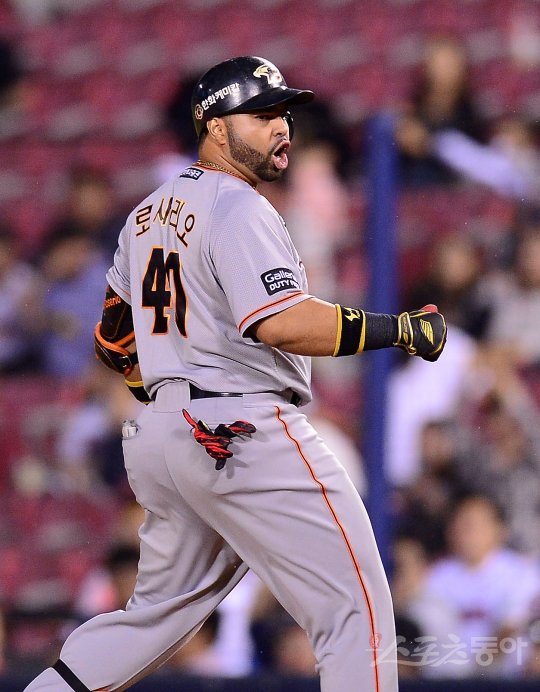 30일 서울 잠실야구장에서 ‘2016 타이어뱅크 KBO 리그’ 한화이글스와 두산베어스 경기가 열렸다. 5회초 2사 1,2루 한화 로사리오가 동점을 만드는 적시타를 치고 1루에서 환호하고 있다.