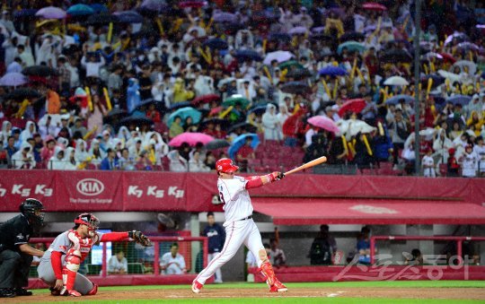 30일 광주 KIA 챔피언스필드에서 ‘2016 타이어뱅크 KBO리그’ KIA 타이거즈와 SK 와이번스의 경기가 열렸다. 6회말 KIA 공격 때 야구장에 비가 내리고 있다.