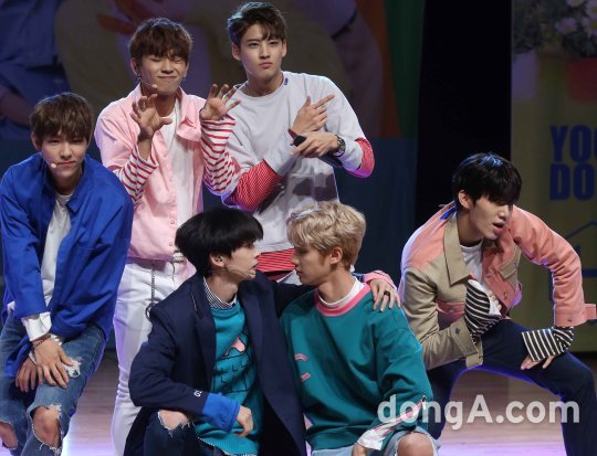 6인조 보이그룹 헤일로가 31일 오후 서울 강남구 일지아트홀에서 열린 두번째 미니 앨범 'HAPPY DAY(해피데이) 발매 쇼케이스에서 포토타임을 하고 있다.