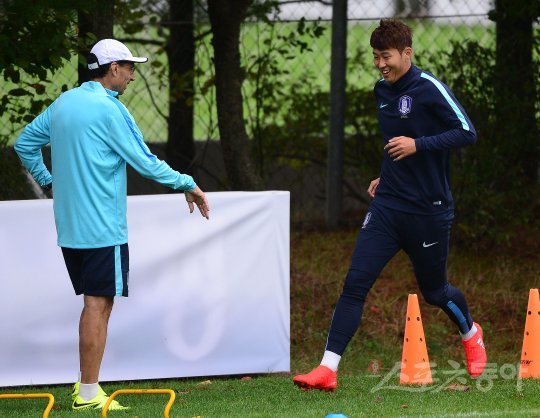 중국과 2018 러시아 월드컵 아시아 지역 최종예선 1차전을 앞둔 축구대표팀이 31일 파주트레이닝센터(NFC)에서 훈련을 가졌다. 손흥민이 런닝 훈련 중 환하게 웃고 있다.