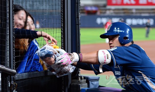 31일 수원 kt위즈파크에서 ‘2016 타이어뱅크 KBO리그’ kt 위즈와 NC 다이노스의 경기가 열렸다. 4회초 2사 2루에서 NC 박석민이 kt 이상화를 상대로 싲느 27호 좌월 투런 홈런을 쏘아올린 뒤 인형을 팬들에게 전달하고 있다.