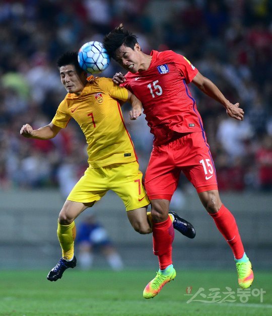 한국 축구대표팀이 1일 서울월드컵경기장에서 중국과 2018 국제축구연맹(FIFA) 러시아 월드컵 아시아 최종예선 1차전을 가졌다. 한국 홍정호와 중국 수비수가 공중볼을 다투고 있다.