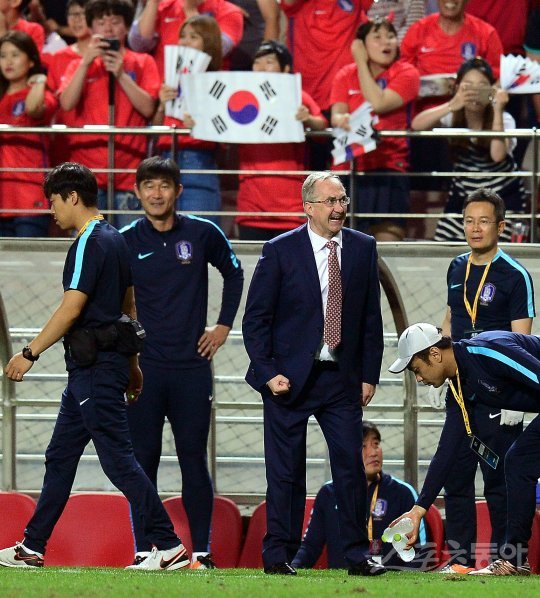 한국 축구대표팀이 1일 서울월드컵경기장에서 중국과 2018 국제축구연맹(FIFA) 러시아 월드컵 아시아 최종예선 1차전을 가졌다. 슈틸리케 감독이 한국의 2번째 골이 들어가자 주먹을 쥐고 기뻐하고 있다.