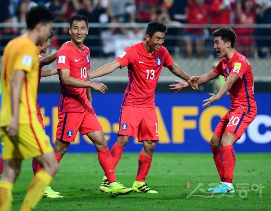 1일 서울 상암 월드컵경기장에서 ‘2018 러시아월드컵’ 한국과 중국의 아시아지역 최종예선 경기가 열렸다. 한국 구자철이 골을 성공한 뒤 동료들과 기쁨을 나누고 있다.