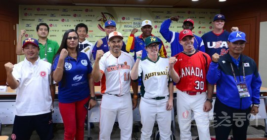 WBSC(세계야구소프트볼연맹) 2016 기장여자야구월드컵 미디어데이가 각국 감독들이 참석한 가운데 2일 부산시 기장군청에서 열렸다. 참가국 감독들이 선전을 다짐하며 화이팅을 외치고 있다.