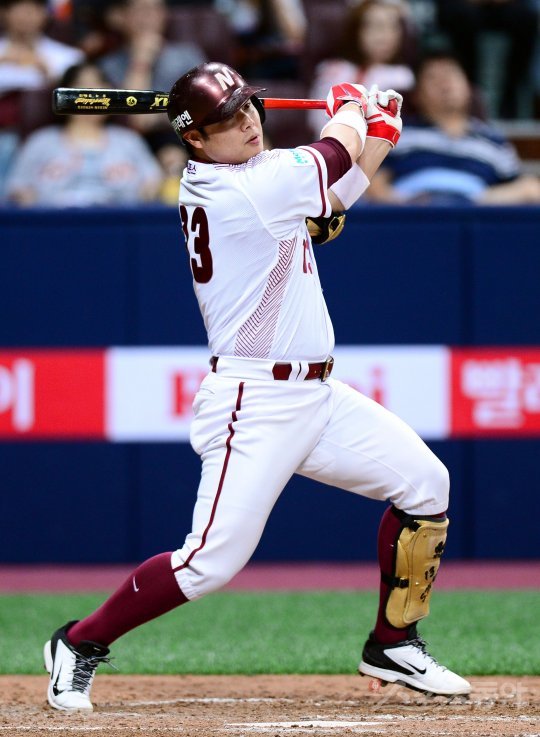 4일 서울 고척스카이돔에서 ‘2016 타이어뱅크 KBO리그’ 넥센 히어로즈와 한화 이글스의 경기가 열렸다. 6회말 2사 만루에서 넥센 윤석민이 3타점 2루타를 날리고 있다.