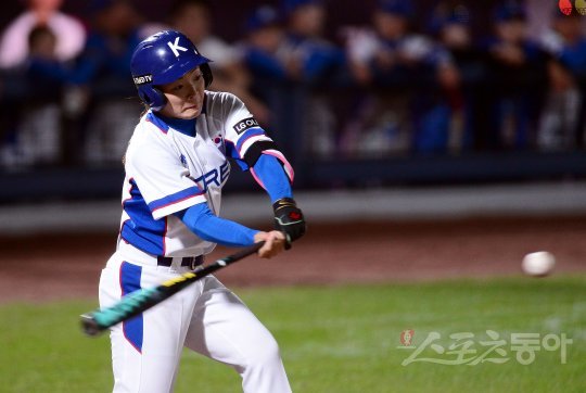 WBSC(세계야구소프트볼연맹) 2016 기장여자야구월드컵 A조 조별예선 2차전 한국과 쿠바 경기가 4일 부산 기장군 현대차 드림볼파크에서 열렸다. 6회말 무사 2루 한국 배유가가 중전 안타를 치고 있다.