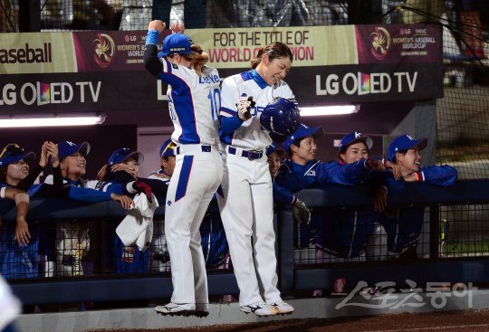 WBSC(세계야구소프트볼연맹) 2016 기장여자야구월드컵 A조 조별예선 2차전 한국과 쿠바 경기가 4일 부산 기장군 현대차 드림볼파크에서 열렸다. 6회말 무사 3루 한국 곽대이 스퀴즈 번트 때 동점 득점에 성공한 배유가가 기뻐하고 있다.