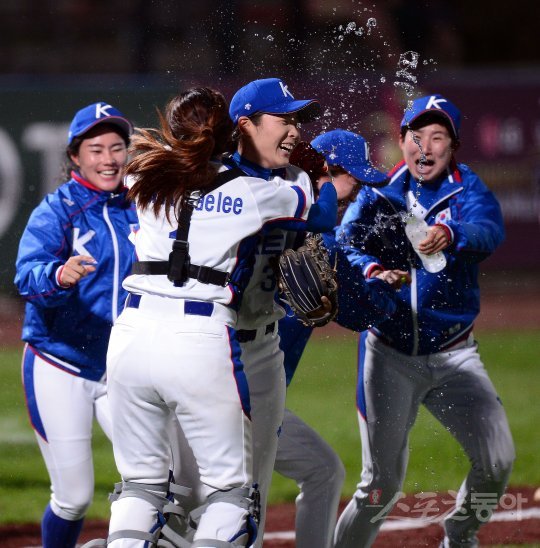 WBSC(세계야구소프트볼연맹) 2016 기장여자야구월드컵 A조 조별예선 2차전 한국과 쿠바 경기가 4일 부산 기장군 현대차 드림볼파크에서 열렸다. 한국이 4-3 짜릿한 역전승을 거둔 후 선수들이 투수 배유가에게 물을 뿌리며 기뻐하고 있다.