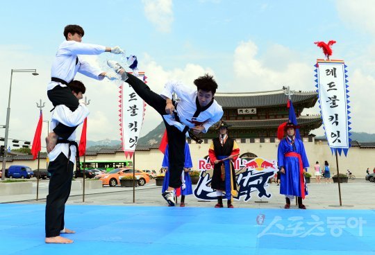 5일 서울 광화문 북측광장에서 열린 세계 최고의 발차기 고수를 가리는 ‘레드불 킥잇 2016’ 쇼케이스 행사에 참가한 미르메 태권도팀이 빙판 격파 퍼포먼스를 선보이고 있다. 예선을 통해 선발된 총 16명의 선수들은 오는 11일 예스24 라이브홀에서 세계 최고의 발차기 고수 자리를 두고 치열한 승부를 펼치게 된다.