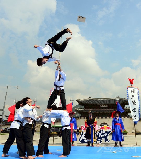 5일 서울 광화문 북측광장에서 열린 세계 최고의 발차기 고수를 가리는 ‘레드불 킥잇 2016’ 쇼케이스 행사에 참가한 미르메 태권도팀이 격파 퍼포먼스를 선보이고 있다. 예선을 통해 선발된 총 16명의 선수들은 오는 11일 예스24 라이브홀에서 세계 최고의 발차기 고수 자리를 두고 치열한 승부를 펼치게 된다.