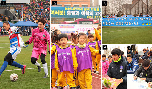 ① 지난해 충남 논산에서 열린 ‘추캥’ 자선경기에서 정대세(왼쪽)가 연제민과 볼을 다투며 즐겁게 뛰고 있다. ② 논산시 어린이들이 경기장 한편에 모여 선수들과의 만남을 기다리고 있다. ③ 추캥은 6·25전쟁 참전용사 및 미망인들을 위한 플래카드를 제작해 감사의 뜻을 전했다. ④ 서울이랜드FC 박건하 감독(오른쪽)이 결연증서를 전달하고 있다. ⑤ 정성룡, 이호, 백지훈(왼쪽부터)이 팬들에게 사인을 해주고 있다. 사진제공|오장은 수원삼성 선수
