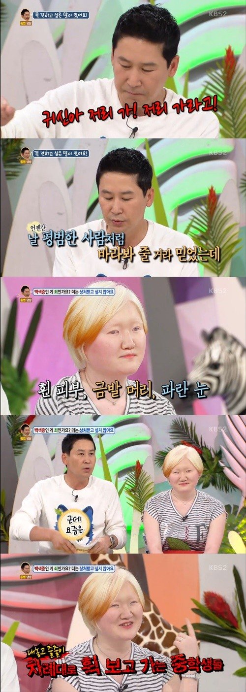 이날 백색증으로 파란 눈, 금발 머리카락, 투명하게 흰 피부를 가진 사연자는 “어렸을 때는 외모 때문에 친구를 사귈 수가 없었고, 늘 괴롭힘에 시달렸다”고 말했다.