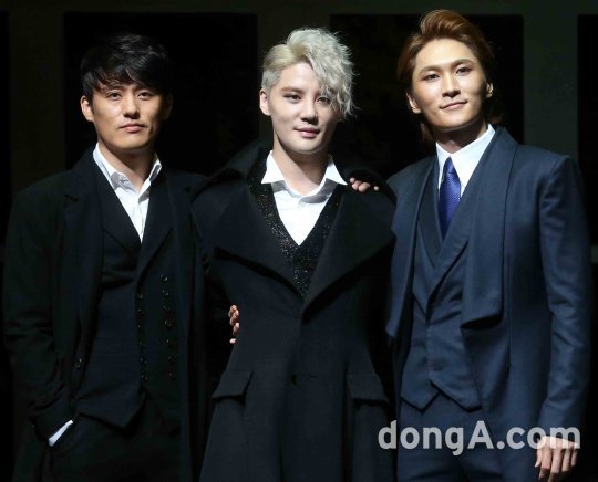 배우 최재웅, 김준수, 박은태(왼쪽부터)가 6일 오후 경기 성남아트센터 오페라하우스에서 열린 뮤지컬 '도리안 그레이' 프레스콜에서 포토타임을 하고 있다,