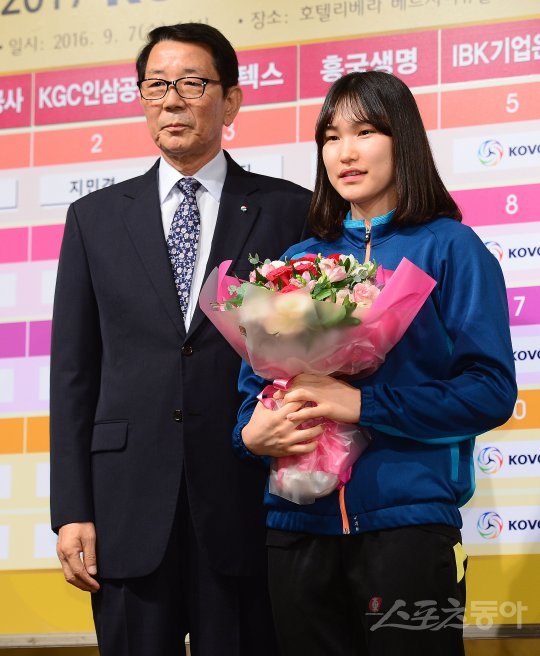 7일 서울 강남 리베라호텔에서 ‘2016-2017 KOVO 여자 신인선수 드래프트’가 열렸다. 전체 3순위로 GS칼텍스에 지명이 된 강릉여고 안혜진이 이선구 감독과 기념촬영을 하고 있다.
