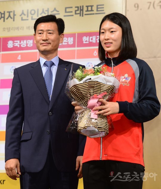 7일 서울 강남 리베라호텔에서 ‘2016-2017 KOVO 여자 신인선수 드래프트’가 열렸다. 전체 2순위로 KGC 인삼공사에 지명이 된 선명여고 지민경이 서남원 감독과 기념촬영을 하고 있다.