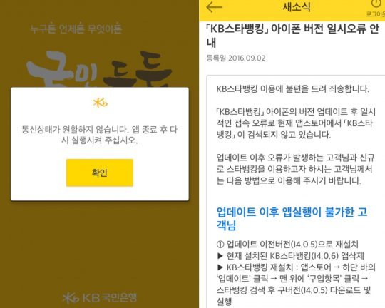 결국 KB은행 측은 이날 “일시오류로 불편을 드려 죄송하다”면서 “업데이트 이후 앱실행이 불가한 고객은 구버전을 다운로드 받거나 미니 버전을 사용하라”고 공지를 띄웠다.