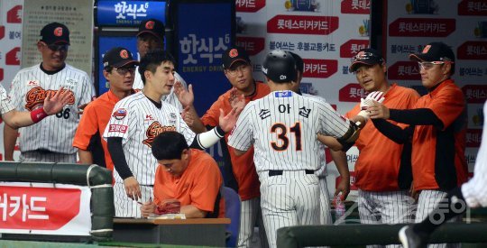 7일 부산 사직야구장에서 ‘2016 타이어뱅크 KBO 리그’ 두산베어스와 롯데자이언츠 경기가 열렸다. 1회말 무사 롯데 선두타자 손아섭이 솔로 홈런을 날리고 그라운드를 돌아 홈인해 하이파이브 하고 있다.