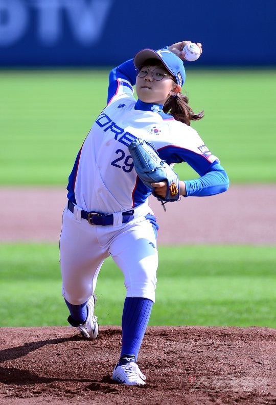 WBSC(세계야구소프트볼연맹) 2016 기장여자야구월드컵 슈퍼라운드 한국과 호주 경기가 8일 부산 기장군 현대차 드림볼파크에서 열렸다. 선발 투수로 등판한 한국 김라경이 역투하고 있다.