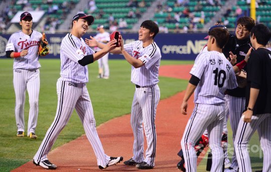 8일 잠실야구장에서 ‘2016 타이어뱅크 KBO 리그’ LG 트윈스와 두산 베어스의 경기가 열렸다. LG 선발 임찬규(왼쪽 두 번째)가 1회초 이닝을 마친 후 더그아웃의 동료들의 축하를 받고 있다.