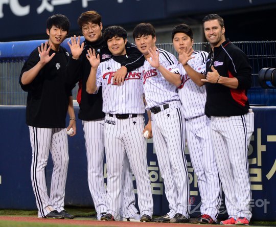 8일 잠실야구장에서 ‘2016 타이어뱅크 KBO 리그’ LG 트윈스와 두산 베어스의 경기가 열렸다. 경기를 앞두고 LG 투수조 선수들이 카메라를 향해 포즈를 취하고 있다.