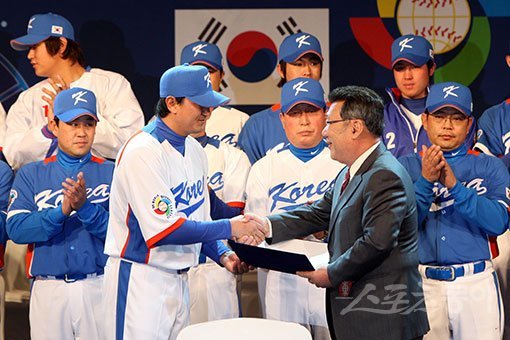 8일 세상을 떠난 하일성 전 KBO사무총장은 1980년대부터 2000년대 초반까지 명 해설가로 이름을 날린 뒤 2006년 프로야구행정가로 변신했다. 2008베이징올림픽 야구대표팀 단장으로 금메달 수상을 함께했고, 2009년 준우승을 차지한 제2회 월드베이스볼클래식(WBC)때는 김인식 감독 선임을 주도했다. 2009년 대회 직전 고인(맨 앞 오른쪽)이 김인식 감독 앞에서 선수대표 손민한에게 출정서를 받으며 웃었다. 스포츠동아DB