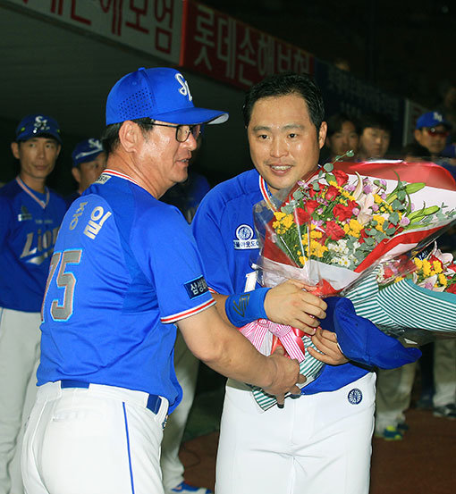 삼성 박한이(오른쪽)가 8일 사직 롯데전 1회 첫 타석에서 조쉬 린드블럼을 상대로 KBO리그 역대 9번째 개인 통산 2000안타를 달성하자 이닝 종료 후 류중일 감독이 꽃다발을 건네며 축하하고 있다. 사진제공|스포츠코리아