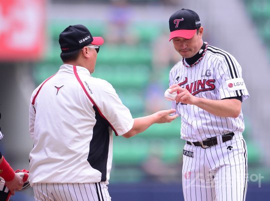 11일 잠실야구장에서 ‘2016 타이어뱅크 KBO 리그’ LG 트윈스와 롯데 자이언츠의 경기가 열렸다. 3회초 롯데 손아섭에게 볼넷을 허용한 LG 선발 봉중근이 강판당하고 있다. 봉중근은 이날 2이닝 5피안타 4실점을 기록했다.