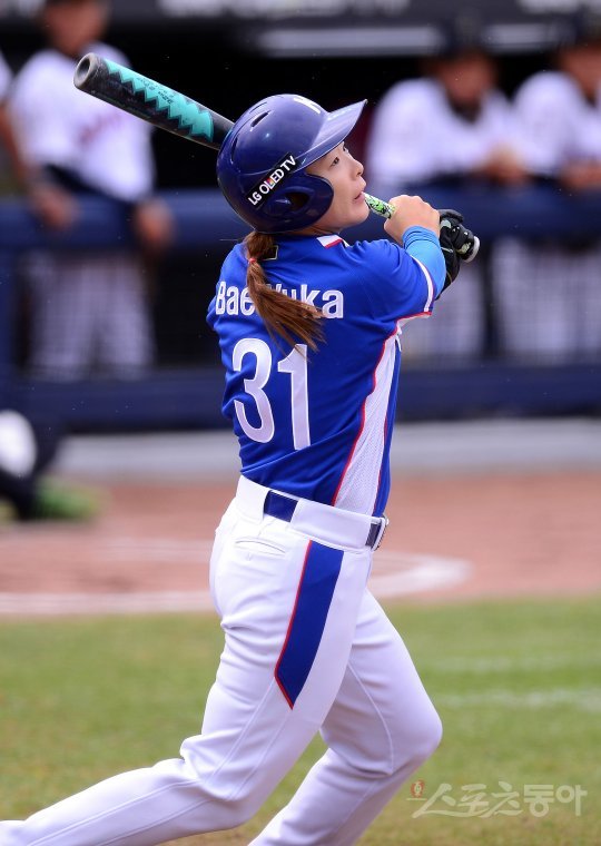 WBSC(세계야구소프트볼연맹) 2016 기장여자야구월드컵 슈퍼라운드 한국과 일본 경기가 10일 부산 기장군 현대차 드림볼파크에서 열렸다. 7회초 1사 한국 배유가가 우전 안타를 치고 있다.