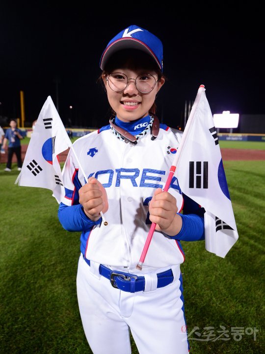 11일 부산 기장군 현대차 드림볼파크에서 열린 WBSC(세계야구소프트볼연맹) 2016 기장여자야구월드컵 폐막식을 마친 한국 김라경이 태극기를 들고 기념촬영을 하고 있다.