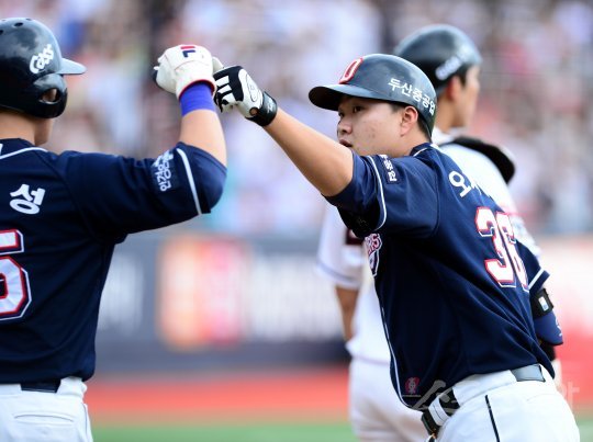 18일 수원 kt위즈파크에서 ‘2016 타이어뱅크 KBO리그’ kt 위즈와 두산 베어스의 경기가 열렸다. 1회초 1사 1루에서 두산 오재일이 kt 선발 밴와트를 상대로 우월 투런 홈런을 쏘아올린 뒤 국해성의 환영을 받고 있다.