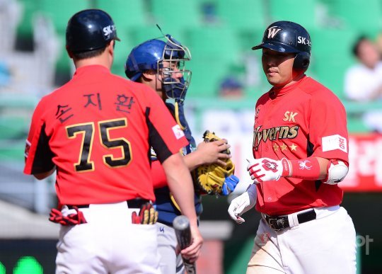 18일 인천 SK행복드림구장에서 ‘2016 타이어뱅크 KBO리그’ SK 와이번스와 NC 다이노스의 경기가 열렸다. 4회말 선두타자로 나온 SK 최정이 NC 선발 최금강을 상대로 시즌 39호 솔로홈런을 치고 손지환 코치의 축하를 받고 있다. 이 홈런으로 최정은 SK 팀 최초이자 KBO리그 최초로 100득점-100타점을 기록한 3루수가 됐다.
