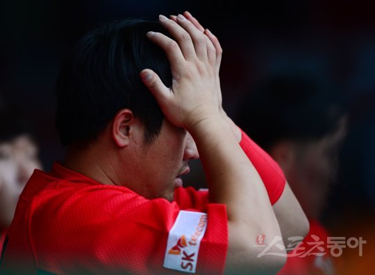 18일 인천 SK행복드림구장에서 ‘2016 타이어뱅크 KBO리그’ SK 와이번스와 NC 다이노스의 경기가 열렸다. 8회말 SK 최정이 더그아웃에서 경기를 보는 중 머리를 감싸고 있다.