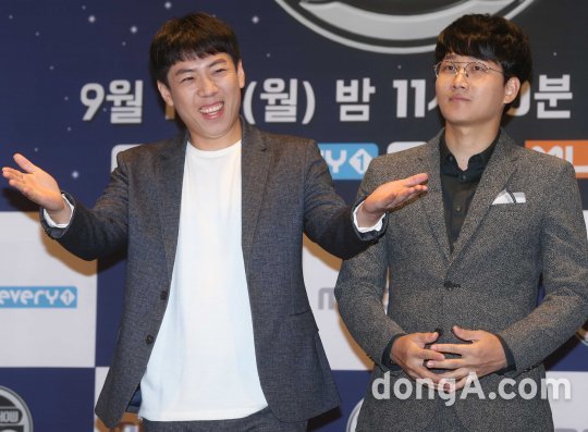 개그맨 양세찬(왼쪽)과 이용진 19일 오전 서울 영등포구 여의도 IFC몰에서 열린 방송 '스타쇼360' 제작발표회에 참석해 포토타임을 하고 있다.