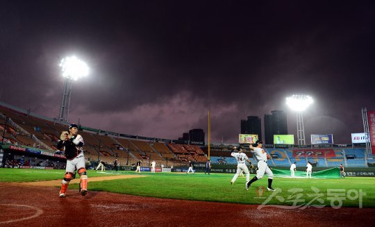19일 부산 사직야구장에서 ‘2016 타이어뱅크 KBO리그’ 롯데 자이언츠와 넥센 히어로즈의 경기가 열린다. 경기전 먹구름이 몰려오는 가운데 선수들이 몸을 풀고 있다.