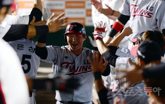 20일 대전 한화생명 이글스파크에서 ‘2016 타이어뱅크 KBO리그’ 한화 이글스와 LG 트윈스의 경기가 열렸다. 7회초 1사 1, 2루에서 LG 오지환이 한화 윤규진을 상대로 시즌 20호 우월 3점 홈런을 쏘아올린 뒤 동료들의 환영을 받고 있다.