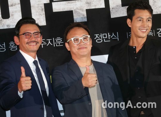 배우 황정민, 감독 김성수, 정우성(왼쪽부터)이 21일 오후 서울 성동구 왕십리 한 멀티플렉스관에서 열린 영화 '아수라' 언론시사회에 참석하고 있다.