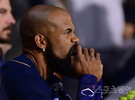 21일 잠실야구장에서 ‘2016 타이어뱅크 KBO 리그’ LG 트윈스와 NC 다이노스의 경기가 열렸다. 8회초 NC 공격에서 테임즈가 더그아웃에서 경기가 안풀리자 얼굴을 찡그리고 있다.