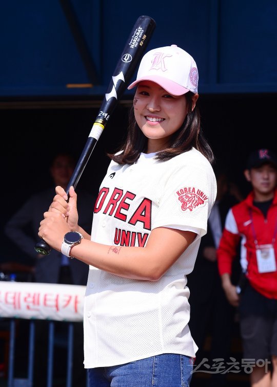 23일 서울 잠실야구장에서 ‘2016 정기 연고전’ 개막식 및 야구 경기가 열렸다. 고려대 국제스포츠학부에 재학 중인 LPGA 전인지가 기념촬영을 하고 있다.