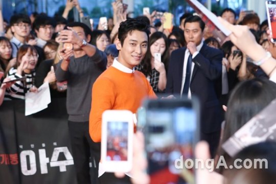 배우 주지훈이 23일 오후 서울 영등포구 영등포타임스퀘어에서 열린 영화 '아수라' 레드카펫 행사에 참석해 이벤트를 진행하고 있다.