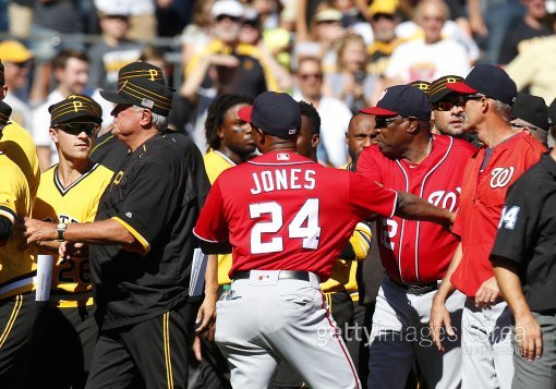 위협구가 강정호의 속임 동작 때문? 피츠버그 파이어리츠와 워싱턴 내셔널스의 경기에서 벤치 클리어링이 벌어져 관심을 모으고 있다.