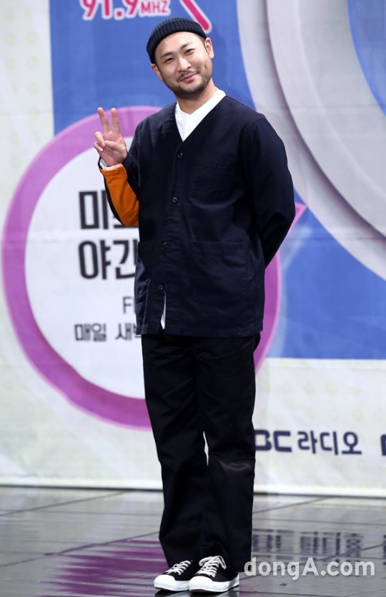 에픽하이의 멤버 미쓰라가 26일 오전 서울 마포구 상암MBC에서 열린 2016 MBC라디오 신입DJ 기자간담회에 참석해 포토타임을 하고 있다.