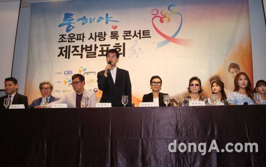 원로 작사가 조운파(가운데)가 26일 오전 서울 반포 팔레스호텔에서 열린 '조운파 사랑 톡 콘서트 '기자회견에서 인사말을 하고 있다.
